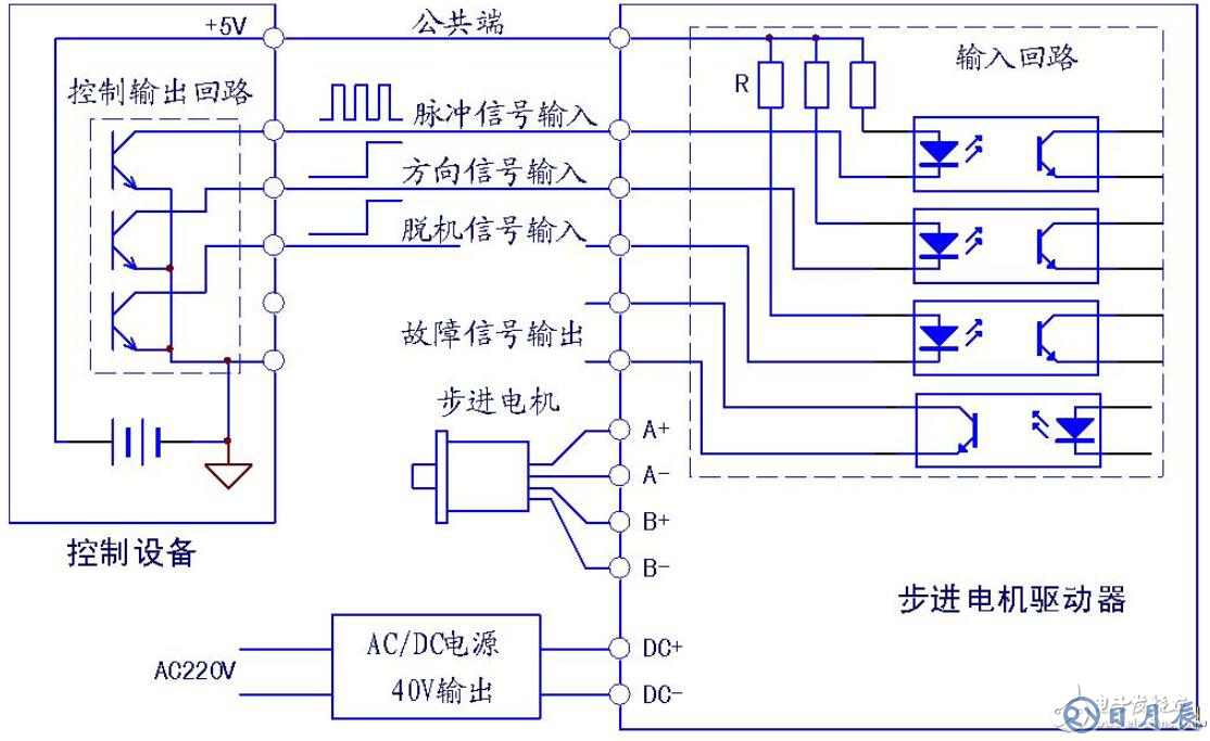左圖為兩相步進(jìn)電機(jī)驅(qū)動(dòng)器的接線圖,控制設(shè)備可以是PLC的輸出回路,也可以是其它電器設(shè)備。步進(jìn)電機(jī)驅(qū)動(dòng)器最重要的控制信號(hào)有兩個(gè):脈沖信號(hào)和方向信號(hào)。脈沖信號(hào)決定步進(jìn)電動(dòng)機(jī)的運(yùn)轉(zhuǎn)速度,方向信號(hào),決定步進(jìn)電動(dòng)機(jī)的旋轉(zhuǎn)方向。不僅僅是PLC ,任何設(shè)備只要能給出這兩個(gè)控制信號(hào),便能控制步進(jìn)電機(jī)的步進(jìn)、轉(zhuǎn)速和旋轉(zhuǎn)方向。從脈沖信號(hào)輸入腳輸入的是頻率可變的、脈沖個(gè)數(shù)可控的脈沖信號(hào),這種信號(hào)可由純硬件電路或軟件程序生成;方向信號(hào)則為常規(guī)開(kāi)關(guān)量信號(hào)。
