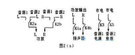 2.音源選擇:按開/選擇鍵,IC2第13腳先輸出低電平,使紅色LED6點亮作電源接通顯示,并使V4導(dǎo)通,K1得電吸合,將功放電源接通。3秒后第13腳恢復(fù)為高電平,第14腳轉(zhuǎn)為低電平,使綠色LED7點亮作音源1接通顯示,V5導(dǎo)通,使K2、K3得電吸合,接通圖2(a)中的音源1信號和電源。因VD2作用,V4仍導(dǎo)通,使K1吸合接通功放電源。同時經(jīng)VD8也使K4得電吸合接通揚聲器。