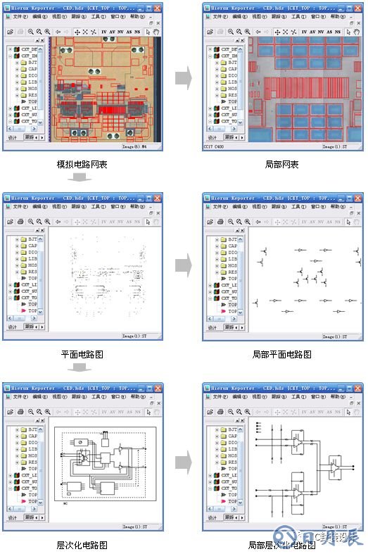 輔助類工具軟件當(dāng)然,除了這三大EDA廠商的IC設(shè)計(jì)工具外,Altera 、Xilinx、KeilSoftware這三家公司的軟件quartus ii、ISE、KEIL開發(fā)環(huán)境等,都是對(duì)于IC設(shè)計(jì)流程中比不可少的工具。它們分別是用于FPGA、單片機(jī)ARM芯片的開發(fā)。這類軟件在芯片的CP測(cè)試和芯片應(yīng)用方案開發(fā)上會(huì)有用到。版圖提取工具,NetEditorLite、ChipAnalyzer,這兩個(gè)工具主要是針對(duì)芯片反向設(shè)計(jì)而言的。算法設(shè)計(jì)工具,MATLAB,此工具應(yīng)用范圍很廣,但對(duì)于芯片設(shè)計(jì)來說,它較為適用于算法原型開發(fā),例如,通信算法。PCB版圖工具,Altium Designer,Orcad,Allegro。其中,目前Orcad,Allegro是屬于cadence電路系統(tǒng)設(shè)計(jì)套件內(nèi)的主要軟件,而Altium Designer是最常用的軟件,它的前身是Protel。Labview與數(shù)字源表,這一對(duì)軟硬件主要用于芯片電氣參數(shù)的半自動(dòng)化測(cè)試,特別是模擬芯片。其目的是芯片設(shè)計(jì)公司用于分析芯片樣品參數(shù)用。對(duì)于這些工具的該如何使用,我會(huì)在下面的文章中進(jìn)行說明。ps:沒有具體說明軟件使用環(huán)境的,一般是在windows環(huán)境下使用。先從反向設(shè)計(jì)說起。下面是我整理的芯片反向設(shè)計(jì)的流程圖。