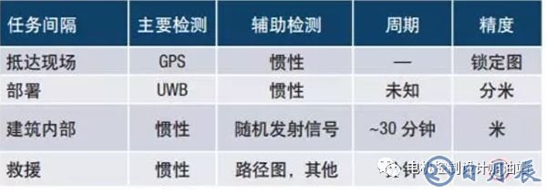 在具體的急救人員追蹤案例中,任務(wù)被劃分為以下幾個(gè)階段,以便更好地評(píng)估傳感器處理要求:抵達(dá)現(xiàn)場(chǎng)、部署、進(jìn)入建筑內(nèi)部并援—— 表7.設(shè)想消防車配備了高端GPS/INS系統(tǒng),能夠確定到達(dá)現(xiàn)場(chǎng)車輛的位置,作為已知的參考點(diǎn)。從這一點(diǎn)直到消防員進(jìn)入建筑前,存在不確定和隨機(jī)運(yùn)動(dòng)序列,其精確位置和映射系統(tǒng)依賴于實(shí)施的超寬頻范圍,才能精確鎖定消防員位置和方向。進(jìn)入建筑結(jié)構(gòu)后,慣性傳感器成為主要追蹤傳感器,目標(biāo)是提供幾米的定位精度。