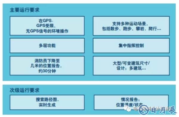 火災(zāi)搜救任務(wù)必須嚴(yán)格按照救援程序執(zhí)行,同時(shí)必須適應(yīng)完全不確定的現(xiàn)實(shí)生活場(chǎng)景??刹渴鸬木_定位系統(tǒng)必須在最大限度內(nèi)適應(yīng)現(xiàn)有的流程和設(shè)備。這就要求無(wú)需任何固定或臨時(shí)基礎(chǔ)設(shè)施即可操作,因?yàn)榧本热藛T通常已背負(fù)重要設(shè)備(重量和成本)。任何系統(tǒng)開發(fā)都應(yīng)遵從實(shí)現(xiàn)小型嵌入式設(shè)備的早期階段目標(biāo)且單位急救人員成本與智能手機(jī)相似。有必要指出,目前智能手機(jī)的定位性能嚴(yán)重不足,因此面臨著挑戰(zhàn)。圖1概述了理想系統(tǒng)最相關(guān)的主要和次要運(yùn)行要求。