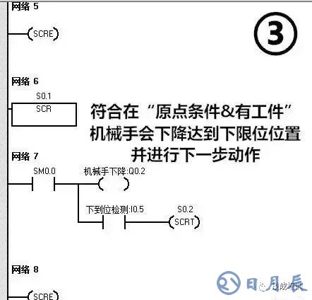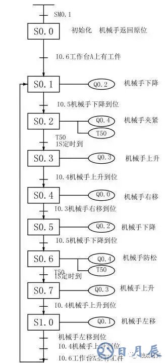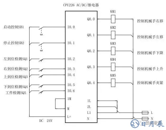3.若原點(diǎn)條件滿足且SQ5閉合(工件A處有工件),按下啟動(dòng)按鈕,機(jī)械手按“原點(diǎn)→下降→夾緊→上升→右移→下降→防松→上升→左移→原點(diǎn)”的步驟工作。