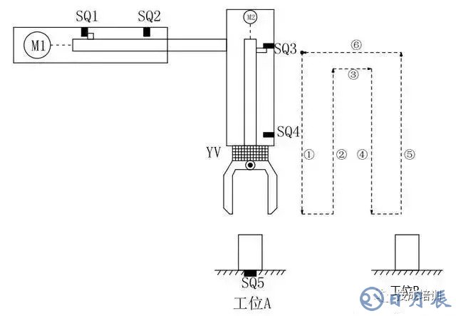 如上圖所示,M1為控制機(jī)械手左右移動(dòng)的電動(dòng)機(jī),M2為控制機(jī)械手上下升降的電動(dòng)機(jī),YV線圈用來控制機(jī)械手夾緊防松,SQ1為左到位檢測開關(guān),SQ2為右到位檢測開關(guān),SQ3為上到位檢測開關(guān),SQ4為下到位檢測開關(guān) ,SQ5為工件檢測開關(guān)。