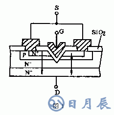 眾所周知,傳統(tǒng)的MOS場效應(yīng)管的柵極、源極和漏極大大致處于同一水平面的芯片上,其工作電流基本上是沿水平方向流動。VMOS管則不同,從圖1上可以看出其兩大結(jié)構(gòu)特點:第一,金屬柵極采用V型槽結(jié)構(gòu);第二,具有垂直導(dǎo)電性。由于漏極是從芯片的背面引出,所以ID不是沿芯片水平流動,而是自重摻雜N+區(qū)(源極S)出發(fā),經(jīng)過P溝道流入輕摻雜N-漂移區(qū),最后垂直向下到達漏極D。電流方向如圖中箭頭所示,因為流通截面積增大,所以能通過大電流。由于在柵極與芯片之間有二氧化硅絕緣層,因此它仍屬于絕緣柵型MOS場效應(yīng)管。