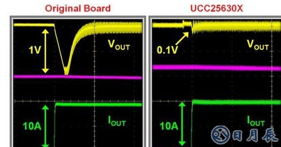 圖一:采用德州儀器混合滯回控制的轉(zhuǎn)換器實(shí)現(xiàn)瞬態(tài)響應(yīng):從空載切換至滿載狀態(tài)時(shí),轉(zhuǎn)換器將輸出電壓的最大偏差限制在1.25%,且輸出電壓在200μs內(nèi)即可恢復(fù)到穩(wěn)態(tài)。