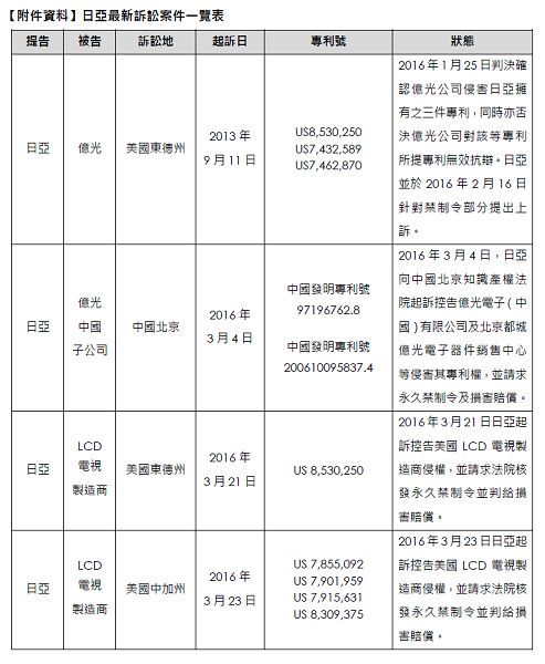 日亞化于上周來(lái)臺(tái)與媒體餐敘中公布數(shù)個(gè)LED專利的侵權(quán)告訴,涵括兩個(gè)在美國(guó)德州地區(qū)法院控告電視制造商Vizio的告訴以及在加州對(duì)億光提出的YAG專利侵權(quán)告訴。