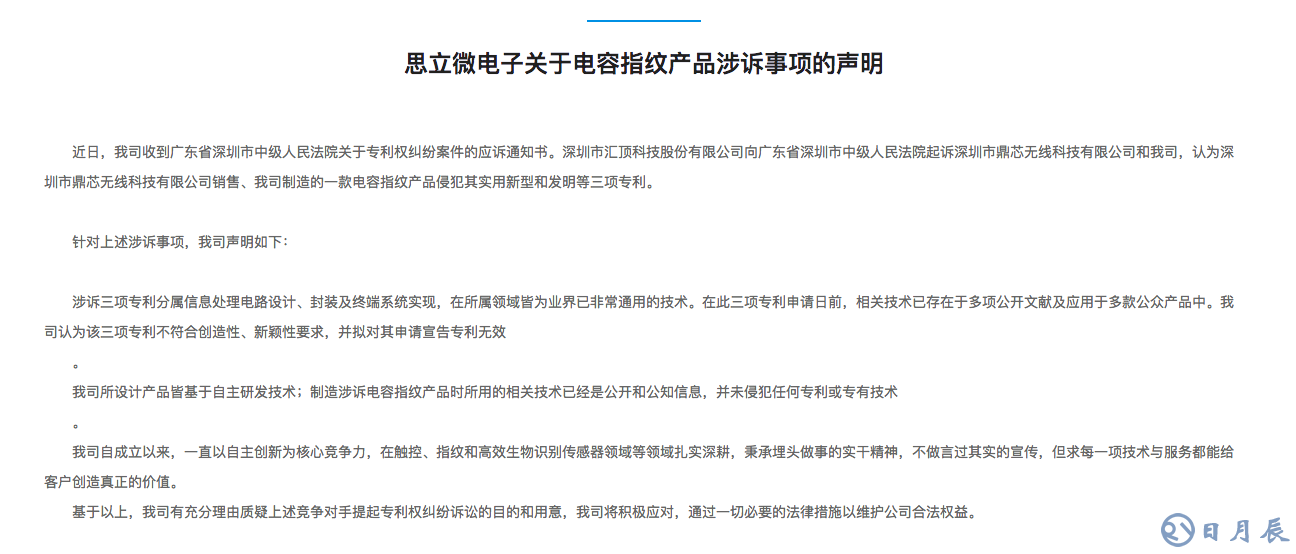 思立微電子關(guān)于電容指紋產(chǎn)品涉訴事項的聲明如下: