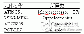 通過左側(cè)的工具欄區(qū)的P(從庫中選擇元件)命令,在Pick devices窗口中選擇系統(tǒng)所需元器件,還可以選擇元件的類別,生產(chǎn)廠家等。本例所需主要元器件有:AT89C51芯片,ADC0808芯片,一個(gè)四位七段數(shù)碼顯示器,一個(gè)可變電阻,詳見表1。