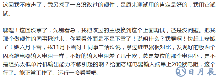 從程序上怎么也看不出問題,可惡的M8不支持仿真又看不到C語言程序具體是怎么執(zhí)行的。沒辦法只好用匯編寫程序吧,這個我熟而且每一步都可控制,肯定不會再出錯了,一個白天加一個晚上把程序就寫出來了,第二天調(diào)試通過,上到操作箱上,天??!又復(fù)位了!