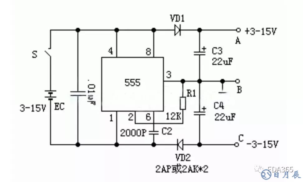 附圖電路中,時基電路555接成無穩(wěn)態(tài)電路,3腳輸出頻率為20KHz、占空比為1:1的方波。3腳為高電平時,C4被充電;低電平時,C3被充電。由于VD1、VD2的存在,C3、C4在電路中只充電不放電,充電最大值為EC,將B端接地,在A、C兩端就得到+/-EC的雙電源。本電路輸出電流超過50mA。