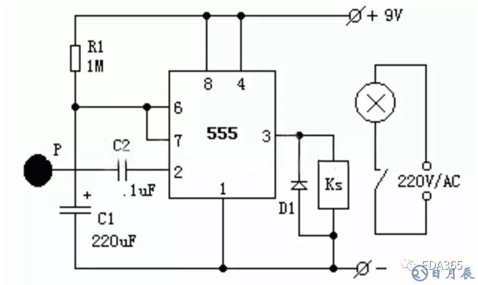 當(dāng)需要開燈時,用手觸碰一下金屬片P,人體感應(yīng)的雜波信號電壓由C2加至555的觸發(fā)端,使555的輸出由低變成高電平,繼電器KS吸合,電燈點亮。同時,555第7腳內(nèi)部截止,電源便通過R1給C1充電,這就是定時的開始。