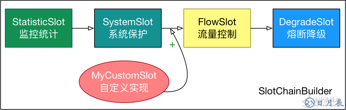 然后實現(xiàn)一個 SlotChainBuilder,可以在 DefaultSlotChainBuilder 的基礎(chǔ)上將我們新的 slot 添加到鏈的尾部(當然也可以不用 DefaultSlotChainBuilder,自由組合現(xiàn)有的 slot):