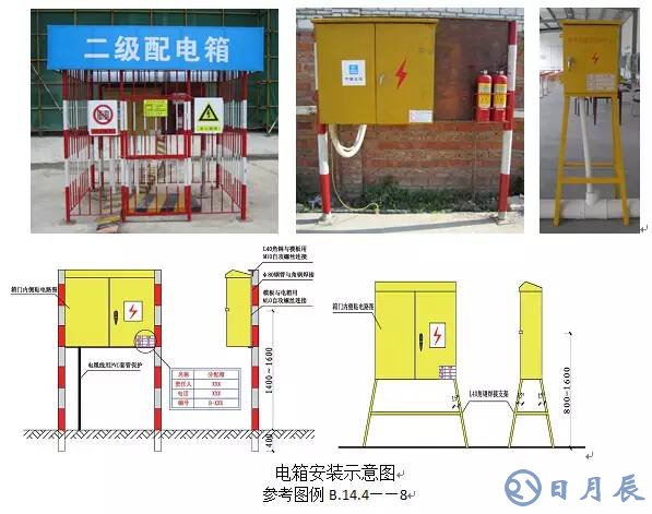 3、配電箱、開關(guān)箱應(yīng)裝設(shè)端正、牢固;固定式配電箱、開關(guān)箱的中心點(diǎn)與地面的垂直距離應(yīng)為1.4~1.6m;移動式配電箱、開關(guān)箱應(yīng)裝設(shè)在堅固的支架上,其中心點(diǎn)與地面的垂直距離宜為0.8~1.6m。(JGJ46-2005第8.1.8條)