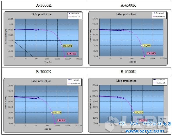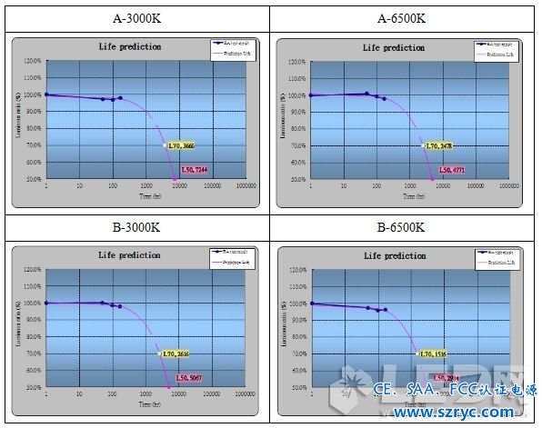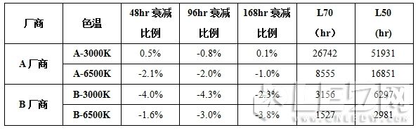 需要說明的一點是:本文中的快速老化試驗所作出的壽命推估只做參考使用,目前還沒有一個快速老化試驗的標準,所以此方法僅作為照明應(yīng)用廠在同等試驗條件下將多家供應(yīng)商的LED顆粒進行比較試驗,擇優(yōu)選取的參考。