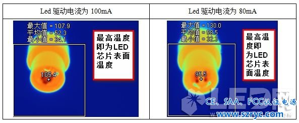 從上圖可以看出,LED驅(qū)動電流下降20%,對應(yīng)的LED芯片表面溫度下降17%。另外130°已經(jīng)超過了LED芯片的最大承受溫度(一般中小功率芯片為115°,較好點的為125°)。過高的溫度不但導致LED芯片損傷,熒光粉激發(fā)效率降低,也會使支架上的反射蓋黃化,從而最終都會導致LED光衰嚴重。