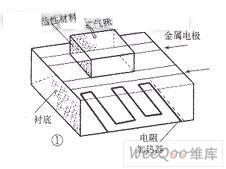 導(dǎo)電性傳感器的基本特點(diǎn)是,其置于揮發(fā)性化合物(VOC)時(shí)的響應(yīng)形式是電阻值發(fā)生變化。導(dǎo)電性傳感器又分為金屬氧化物傳感器和聚合物傳感器兩大類(lèi)。金屬氧化物傳感器在電子鼻系統(tǒng)中應(yīng)用更廣泛,其結(jié)構(gòu)如圖1所示。此類(lèi)傳感器中與VOC相接觸的活性材料是錫、鋅、鈦、鎢或銥的氧化物,襯底材料一般是硅、玻璃、塑料,發(fā)生接觸反應(yīng)需滿(mǎn)足200~400℃的溫度條件,因此在底部設(shè)置了加熱器。氧化物材料中用鉑、鈀等貴重金屬攙雜形成兩條金屬接觸電極。與VOC的相互作用改變了活性材料的導(dǎo)電性,使兩電極之間的電阻發(fā)生變化,這種電阻變化可用單臂電橋或其它電路來(lái)測(cè)量。事實(shí)上,一個(gè)傳感器的活性材料總是設(shè)計(jì)得對(duì)某些特定氣味響應(yīng)最靈敏。