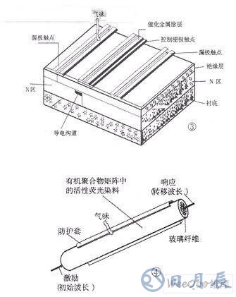 第四類(lèi)實(shí)用的氣味傳感器是光纖傳感器。它對(duì)氣體化合物的響應(yīng)形式是光譜色彩發(fā)生變化。如圖4所示,這種傳感器的主干部分是玻璃纖維,在玻璃纖維的各面敷有很薄的化學(xué)活性材料涂層?;瘜W(xué)活性材料涂層是固定在有機(jī)聚合物矩陣中的熒光染料,當(dāng)與VOC接觸時(shí),來(lái)自外部光源的單頻或窄頻帶光脈沖沿光纖傳播并激勵(lì)活性材料,使其與VOC相互作用反應(yīng)。這種反應(yīng)改變了染料的極性,從而改變了熒光發(fā)射光譜。只要對(duì)許多敷有不同染料混合物的光纖器件構(gòu)成的傳感器陣列產(chǎn)生的光譜變化進(jìn)行檢測(cè)分析,就可以確定對(duì)應(yīng)的氣體化合物成分。光纖傳感器有很強(qiáng)的抗噪能力和極高的靈敏度,其靈敏度單位以ppb(十億分率)計(jì),這是其它電子鼻傳感器類(lèi)型所遠(yuǎn)不及的。目前光纖傳感器的主要缺點(diǎn)是:(1)其設(shè)備控制系統(tǒng)較復(fù)雜,成本較高,(2)熒光染料受白光化作用影響,使用壽命有限。