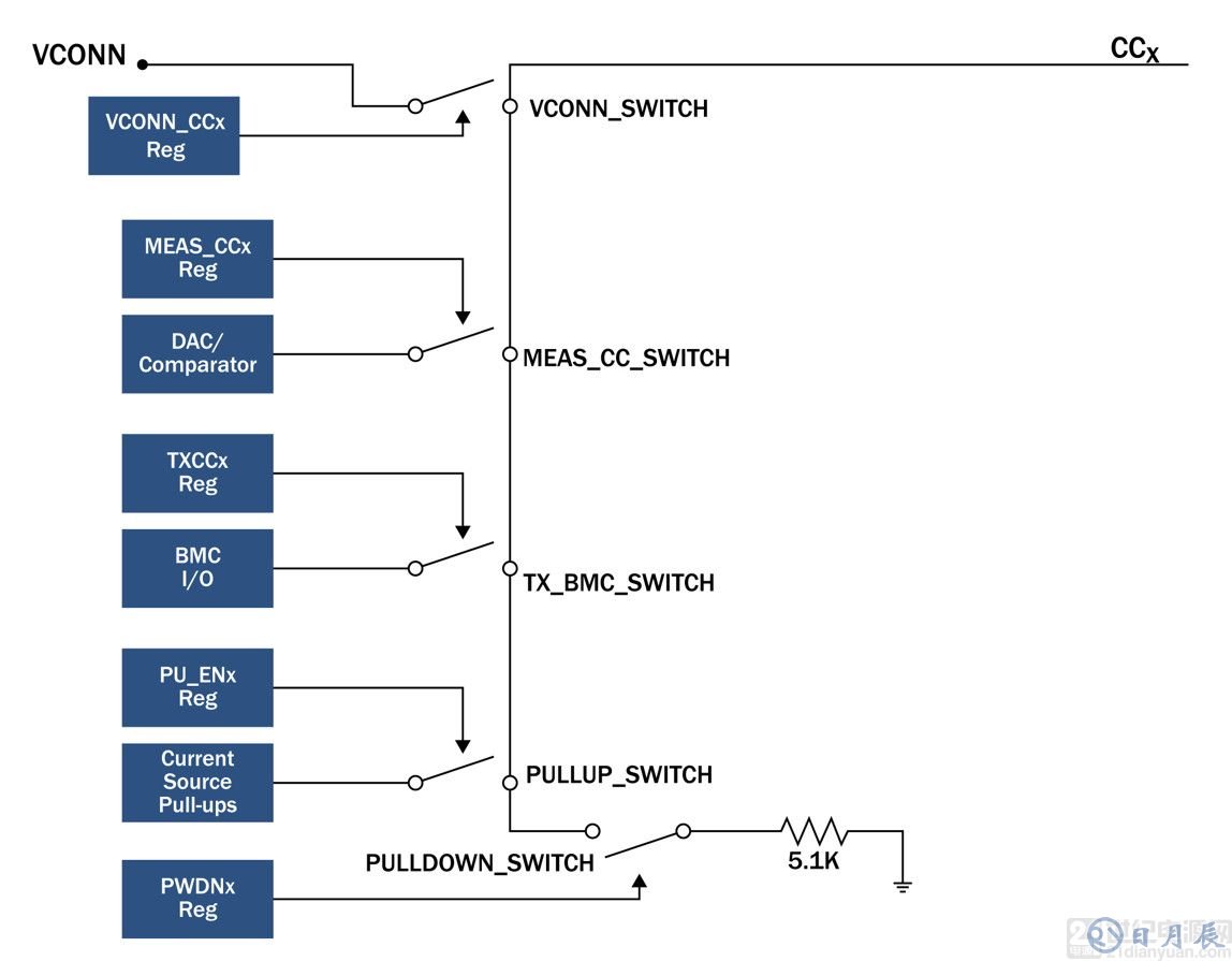 FUSB302B實施了一個CC開關(guān),使它能夠檢測到它是作為設(shè)備主機還是雙角色端口連接,通過多個比較器和由主機處理器上的軟件控制的可編程DAC進行管理(圖3)。