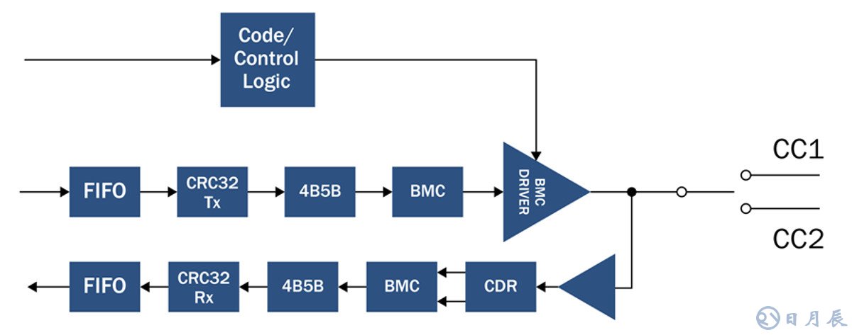 Type-C連接可正反逆插,為用戶帶來了更多的便利,卻使開發(fā)更復(fù)雜。方向通過新的配置通道(CC)管理,該配置通道在連接器上有兩個專用的引腳,并支持連接的設(shè)備協(xié)商需要提供或汲取多少電源。該通道使用的協(xié)議是一種稱為雙相符號編碼(BMC)的差分曼徹斯特編碼。USB Implementer Forum(USB-IF)定義了五個供電配置文件:10W、18W、36W、60W和100 W。使用BMC協(xié)議,電源配置文件可在含USB Type-C接口的兩臺設(shè)備之間進行交換。編碼方案使用轉(zhuǎn)換來表示邏輯電平,而不是絕對電平,并且它結(jié)合了自己的時鐘信號,使得同步更簡單。然而,BMC協(xié)議依賴于一個物理接口,該接口能在具電氣挑戰(zhàn)的環(huán)境中可靠地解碼信號,而且很少有電氣環(huán)境比車輛環(huán)境更具挑戰(zhàn)性。