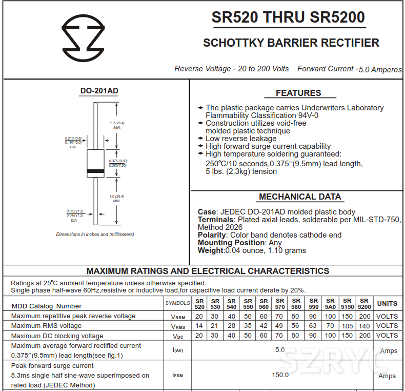 最高反向峰值電壓:200Vpk最大平均整流電流:5.0Aav最大峰值浪涌電流:150Apk最大反向漏電流:5.0UAds正向壓降:0.95Vpk