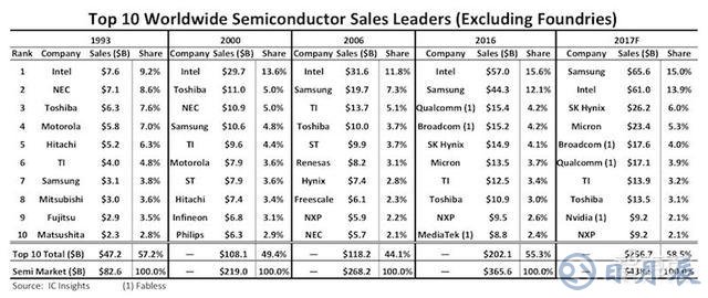 ▲ICInsights機構(gòu)發(fā)布的1993-2017F全球半導(dǎo)體十大廠商變遷圖