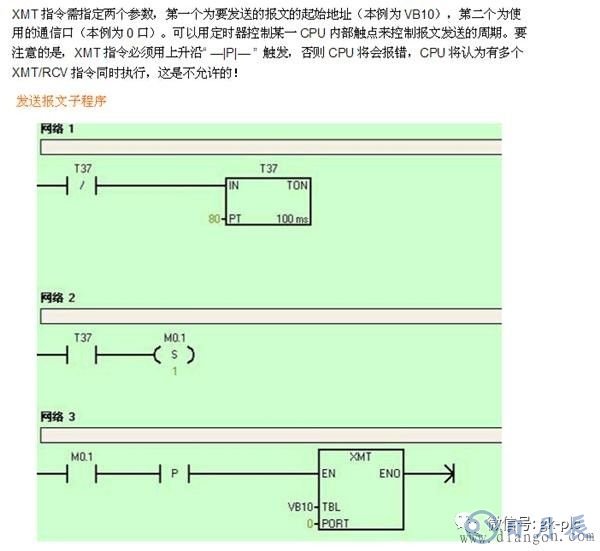 在《S7-200系統(tǒng)手冊(cè)》和Micro/WIN在線幫助中關(guān)于XMT和RCV指令的使用有一個(gè)例子。這個(gè)例子非常經(jīng)典,強(qiáng)烈建議學(xué)習(xí)自由口通信時(shí)先做通這個(gè)例子。例程,見(jiàn)下圖