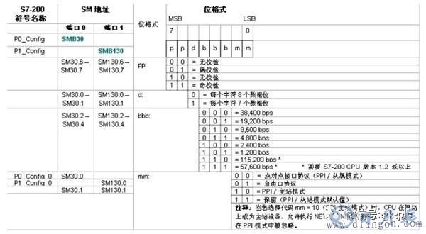 應(yīng)用自由口通信首先要把通信口定義為自由口模式,同時(shí)設(shè)置相應(yīng)的通信波特率和上述通信格式。用戶程序通過(guò)特殊存儲(chǔ)器SMB30(對(duì)端口0)、SMB130(對(duì)端口1)控制通信口的工作模式。詳見(jiàn)下圖