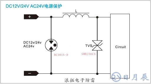 由于前級GDT陶瓷氣體放電管響應時間在微秒級別,而后級TVS瞬態(tài)抑制二極管響應時間在皮秒級別(快百萬倍),所以前級與后級保護元件必需要耦合退耦器件進行延時與分壓;本保護電路采用電感L作為耦合退耦器件,電感L具有阻交流通直流的特性,這一特性可以對浪涌形成阻礙作用,但又不會影響直流電源的傳輸。