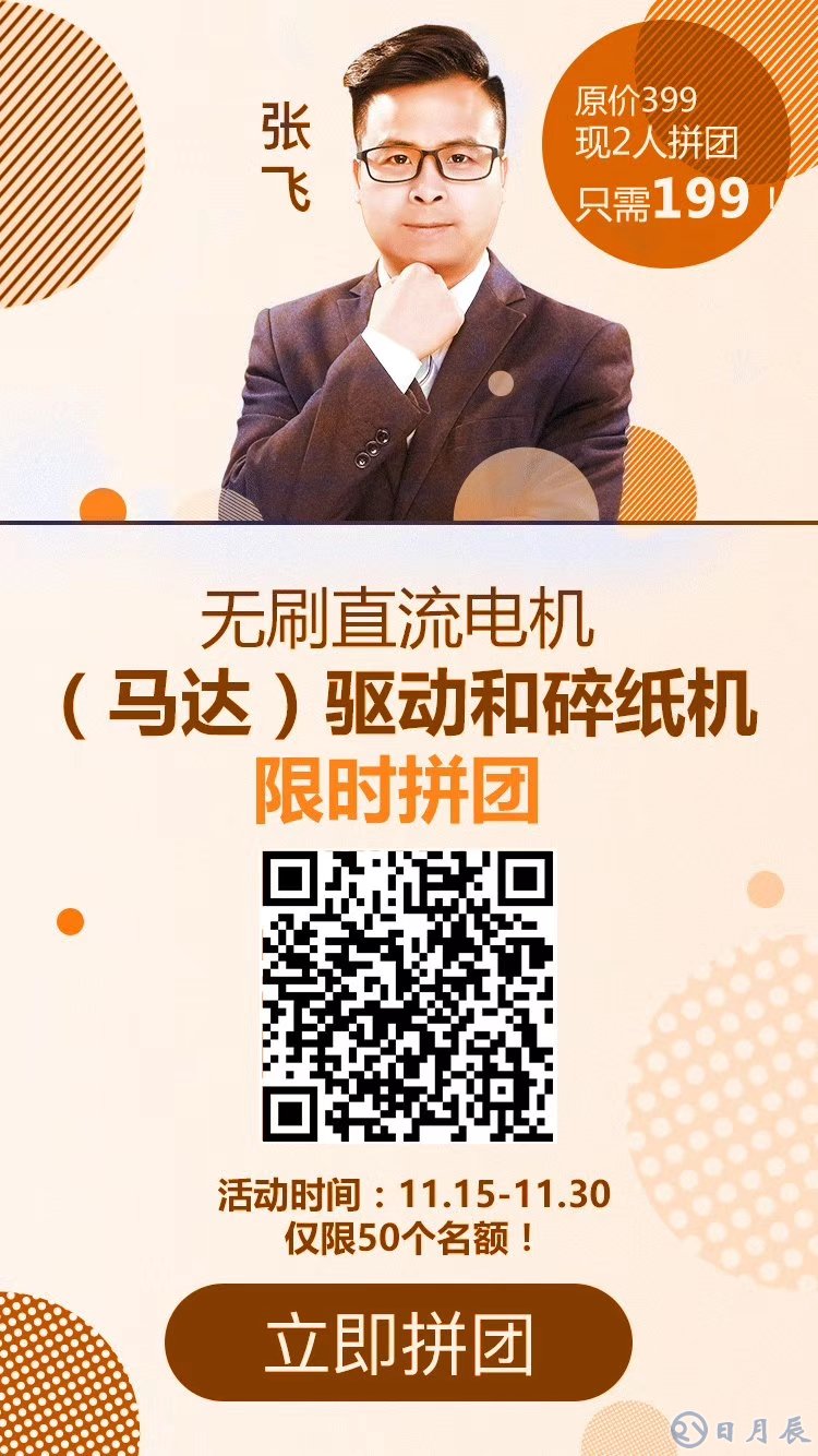 從本月15日至30日,您報(bào)名參與《張飛無刷直流馬達(dá)(驅(qū)動(dòng))和碎紙機(jī)》課程,并邀請您的任一好友參加本次課程拼團(tuán),即可享受活動(dòng)特惠拼團(tuán)價(jià)!