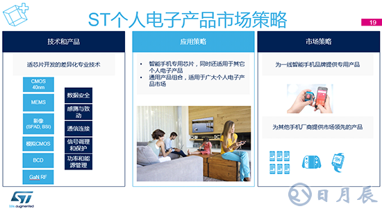 智能個人電子產(chǎn)品市場的體量非常大,所以ST也想進(jìn)入到這個市場。但是,Jean-Marc Chery先生表示:“對于這個市場時,我們是具備選擇性的,選擇真正適合我們的市場來推出相應(yīng)的產(chǎn)品和技術(shù)解決方案。ST主要的關(guān)注的是智能手機(jī),因為智能手機(jī)所帶來的體量和技術(shù),能夠為ST帶來最好的發(fā)展機(jī)會。同時,我們也會支持其他的一些消費級電子產(chǎn)品,例如游戲機(jī)和可穿戴設(shè)備。我們?yōu)樘厥獾闹悄苁謾C(jī)應(yīng)用提供專門的產(chǎn)品,并提供適用于廣大個人電子產(chǎn)品市場的通用產(chǎn)品組合。”