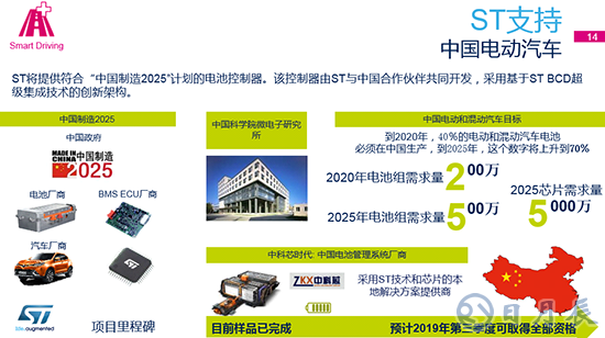 在新能源汽車(包括電動和混動汽車)市場,ST與中國科學(xué)院微電子所和中科芯時代合作開發(fā)了電動汽車電池管理系統(tǒng),利用了ST最先進(jìn)的智能功率(BCD)技術(shù)和SPC5x汽車微控制器。為滿足市場對性能、質(zhì)量和可靠性的要求,三方與中國電池廠商和車企密切合作定義電池控制器解決方案。目前樣品已完成,預(yù)計2019年第三季度可取得全部資格。