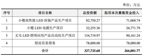 據(jù)公告顯示,募集資金擬用于小欖高性能LED封裝產(chǎn)品生產(chǎn)項(xiàng)目、小欖LED電源生產(chǎn)項(xiàng)目、義烏LED照明應(yīng)用產(chǎn)品自動化生產(chǎn)項(xiàng)目及償還有息債務(wù)。