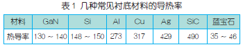 LED是一種固態(tài)的半導體器件,而LED芯片的表面面積較小,工作時電流密度大,且用于照明時往往要求多個LED組合而成。LED密集度大,導致芯片發(fā)熱密度高,而結溫上升會導致光輸出減少,芯片加快蛻化,縮短器件壽命。表1給出了幾種不同材料的熱導率??梢钥闯?,目前在功率型LED的制備中,技術最為成熟、使用最多的藍寶石襯底的熱導率只有35~46W/(m×K),不足Si材料的1/4。