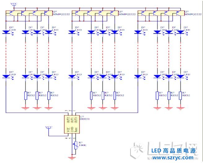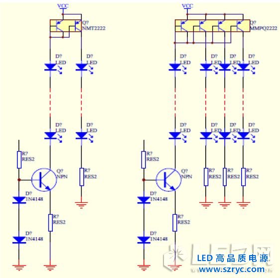 下圖采用集成三極管可以保持每路LED電流一致,這些三極管在相同溫度環(huán)境下、相同工藝條件生產(chǎn)出來的β值一樣,可以保證每路電流基本一樣。恒流部分在要求不是很高的條件下可以這樣設(shè)計,穩(wěn)定的電壓或穩(wěn)定的PWM伏值驅(qū)動穩(wěn)壓后的三極管偏壓,做到基本恒流。