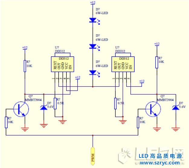 下圖采用DD312并聯(lián)參考設(shè)計直接驅(qū)動3顆6W LED。使能PWM控制信號需要適當(dāng)?shù)母綦x,避免相互干擾和驅(qū)動能力問題。EN使能電壓要符合規(guī)格書要求,不要電壓太高損壞EN腳。一般IC耐壓是指負(fù)載和電源,沒有注明激勵電壓請不要大于5V設(shè)計。
