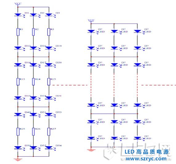 LED因其VF值特性原因做不到相同,隨著溫度及電流大小也有些VF值也會發(fā)生變化,一般不適合并聯(lián)設(shè)計。但是有些情況又不得不并聯(lián)解決多顆LED驅(qū)動成本問題,這些設(shè)計可以為大家做些參考。