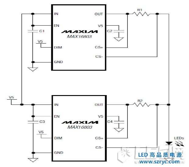 像這種檢測在LED的一端LED恒流驅(qū)動IC也可以并聯(lián)設(shè)計驅(qū)動,實際上IC是單獨工作的,最后在并流一起。DC-DC方式是工作在較高的頻率上,需要注意的是PCB布板時避免交叉設(shè)計,各自濾波、旁路電容要緊靠IC附近,負(fù)載電流最后會和即可。