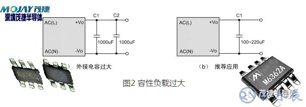 容性負(fù)載過(guò)大,一個(gè)3W的模塊,輸出使用了2000uF的電容,而通過(guò)查閱產(chǎn)品手冊(cè)了解到,建議模塊最大輸出電容為800uF。輸出電容過(guò)大可能導(dǎo)致啟動(dòng)不良或者輸出電壓偏低。建議模塊外接的輸出電容容值不大于產(chǎn)品手冊(cè)規(guī)定的最大容性負(fù)載。