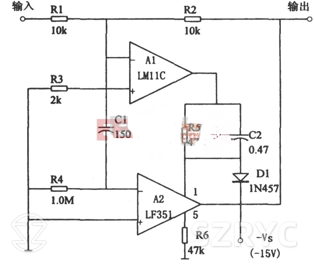 如圖所示為高精度低偏置電流跟隨器電路。電路中采用了通用型集成運放LM11C和場效應(yīng)管輸入型集成運放LF351。LM11C的偏置電流很?。s為l00pA),失調(diào)電壓低(約為0.6mV),共模抑制比達110dB。LF351運算放大器的失調(diào)電壓為10mV,靜態(tài)電流為3.4mA,輸入偏流僅為200PA。電路中A2采用交流耦合,以減小偏置電流。該電路需要較長的過載恢復(fù)時間,其共模輸入電壓也不能超過±l0
