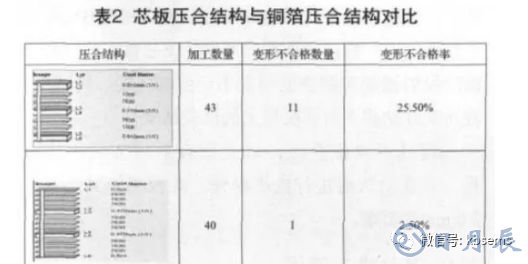 工程設計應該盡量避免結(jié)構(gòu)不對稱、材料不對稱、圖形不對稱的設計,以減少變形的產(chǎn)生,同時在研究過程還發(fā)現(xiàn)芯板直接壓合結(jié)構(gòu)比銅箔壓合結(jié)構(gòu)更容易變形,表2為兩種結(jié)構(gòu)板件的試驗結(jié)果。
