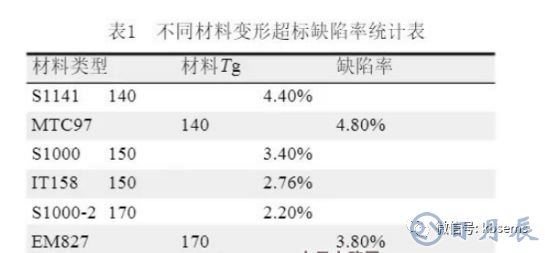 從表中可以看到,低Tg材料變形缺陷率要高于高Tg材料,上表所列高Tg材料均為填料形材料,CTE均小于低Tg材料,同時在壓合以后的加工過程中,烘烤溫度最高150℃,對低Tg材料的影響肯定會大于中高Tg材料。