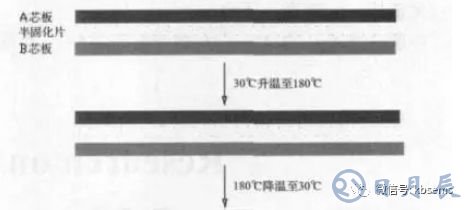 假設有兩種CTE相差較大的芯板通過半固化片壓合在一起,其中A芯板CTE為1.5x10-5/℃,芯板長度均為1000mm。在壓合過程作為粘結(jié)片的半固化片,則經(jīng)過軟化、流動并填充圖形、固化三個階段將兩張芯板粘合在一起。