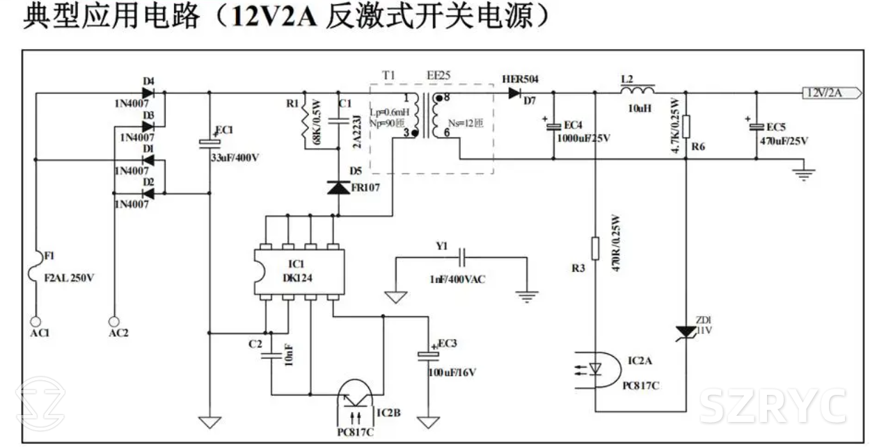 反激式開(kāi)關(guān)電源(Flyback Converter)是一種常用的DC-DC轉(zhuǎn)換器,廣泛應(yīng)用于小功率電源,如充電器、適配器等,提供隔離型的電源解決方案。下面是一個(gè)12V 2A反激式開(kāi)關(guān)電源的工作原理詳解:
