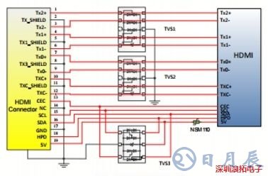 為滿足既能有效進行ESD保護,又不影響高速信號傳輸?shù)囊?,日月辰科技設(shè)計HDMI2.0接口靜電防護方案: