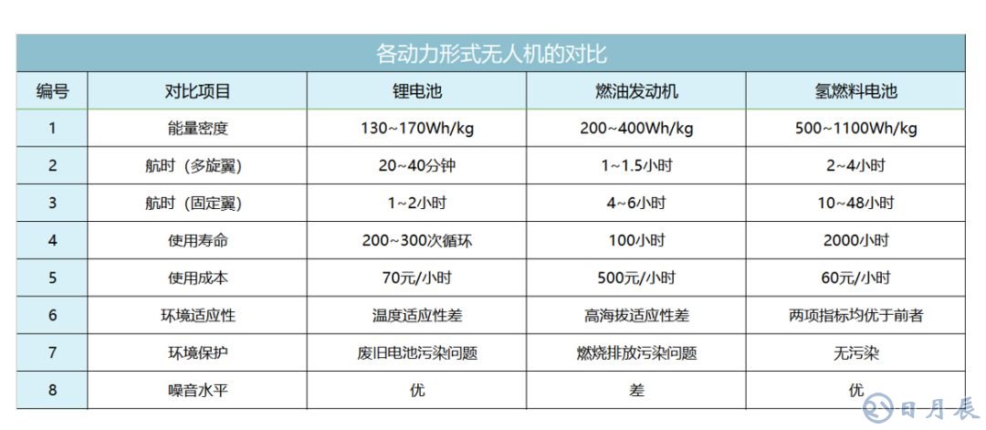 此外,鋰電動(dòng)力無(wú)人機(jī)抗低溫性差;燃油動(dòng)力無(wú)人機(jī)高海拔適應(yīng)性差;燃油發(fā)動(dòng)機(jī)保養(yǎng)周期短,維護(hù)麻煩。而氫燃料動(dòng)力電池工作溫度范圍更廣,高海拔適應(yīng)性強(qiáng),后期保養(yǎng)維護(hù)簡(jiǎn)易。另外,從環(huán)保角度來(lái)看,廢舊鋰電池對(duì)環(huán)境影響很大,而燃油發(fā)動(dòng)機(jī)工作會(huì)產(chǎn)生廢氣排放,并且燃油存在著火風(fēng)險(xiǎn),引發(fā)次生災(zāi)害。氫燃料電池只會(huì)產(chǎn)生水和熱,整個(gè)循環(huán)就是徹底的不產(chǎn)生有害物質(zhì)排放的過(guò)程。更重要的是,鋰電池的充電效率低,鋰電池循環(huán)壽命短,實(shí)際費(fèi)用高;燃油發(fā)動(dòng)機(jī)保養(yǎng)周期短,維護(hù)費(fèi)高,但是氫燃料電池?zé)o人機(jī)的綜合成本會(huì)顯得更低。