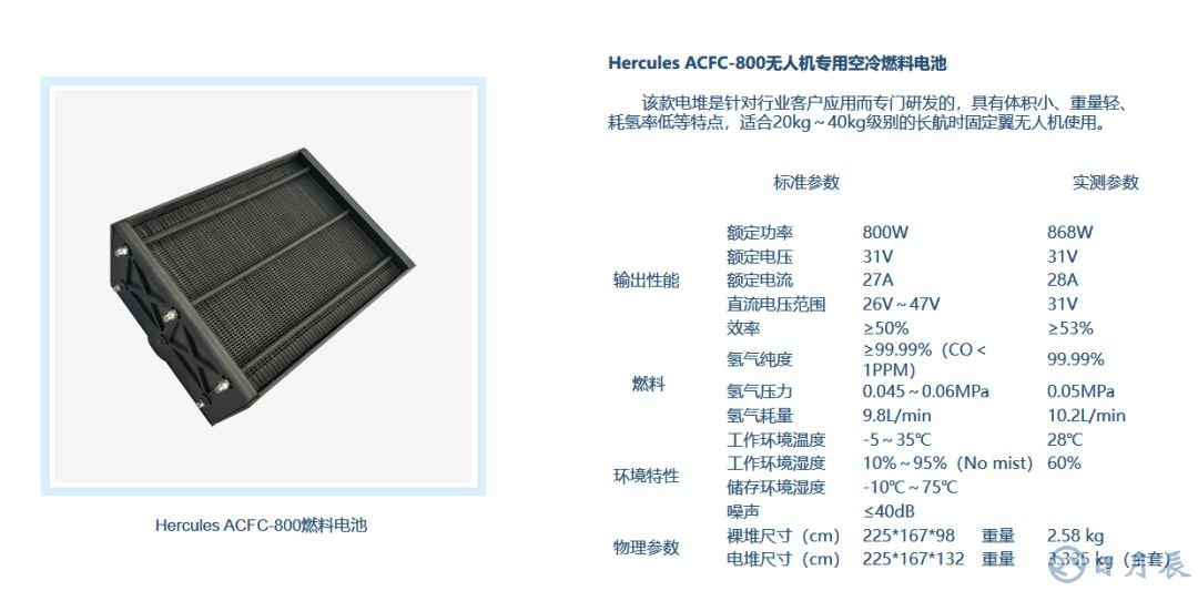 800W空冷燃料電池,具有體積小、耗氫率低等特點(diǎn),適合20kg~40kg級(jí)別的長(zhǎng)航時(shí)固定翼無(wú)人機(jī)使用