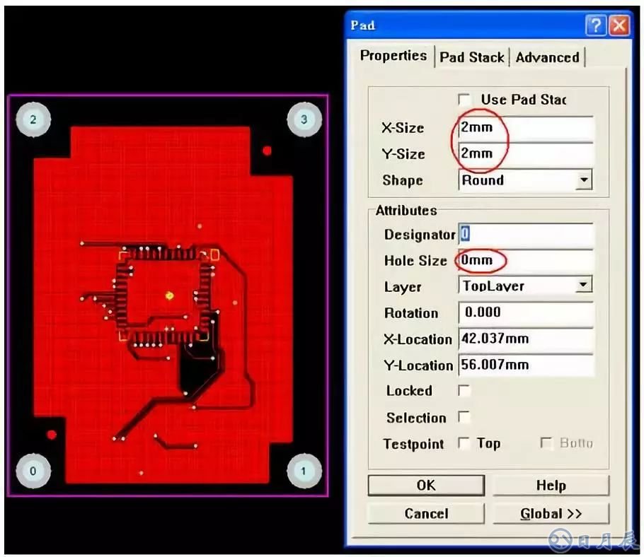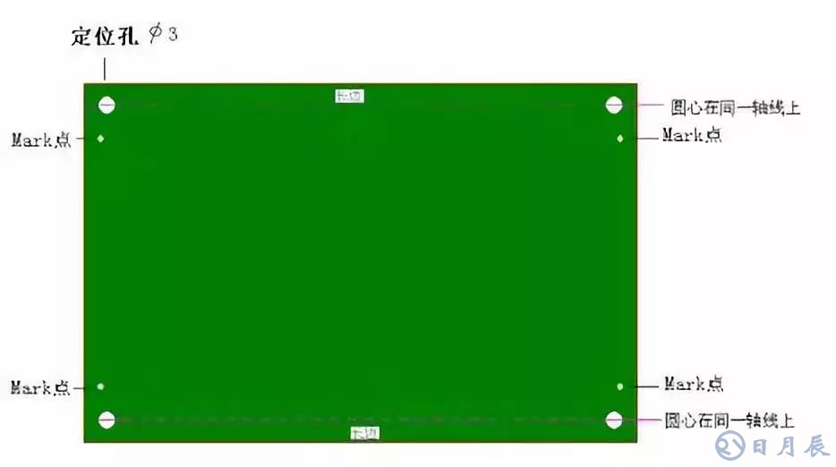 1. 關于定位孔:PCB板的四角要留四個孔(最小孔徑 2.5mm),用于印刷錫膏時定位電路板。要求X軸或Y軸方向圓心在同一軸線上,如下圖: