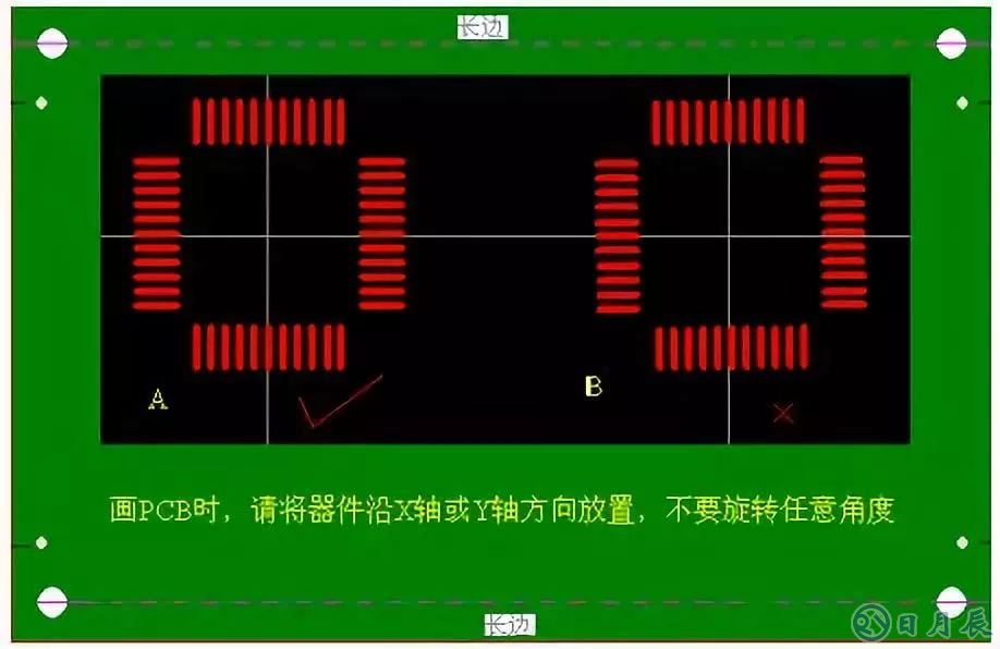 9. 放置器件不要旋轉任意角度:由于貼片機無法旋轉任意角度,只能旋轉90℃、180℃、270℃、360℃。如下圖B 旋轉了1℃,貼片機貼裝后器件管腳與電路板上的焊盤就會錯開1℃的角度,從而影響焊接質量。