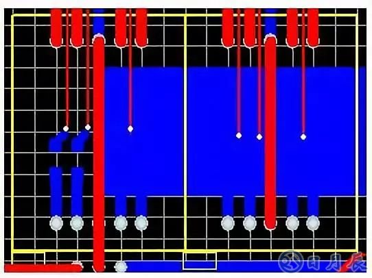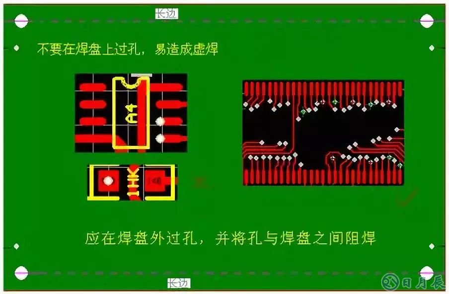 4. 不要直接在焊盤上過孔:直接在焊盤上過孔的缺陷是在過回流時錫膏熔化后流到過孔內,造成器件焊盤缺錫,從而形成虛焊。如圖:
