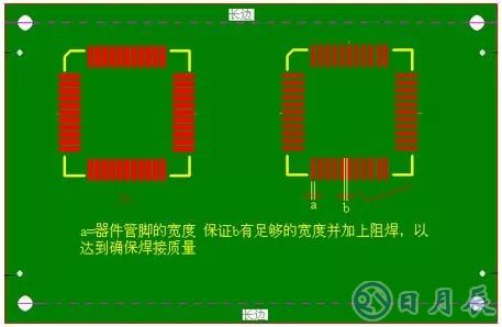 8. 關于IC焊盤的寬度:SOP、PLCC、QFP等封裝的IC,畫PCB時應注意焊盤的寬度,PCB上焊盤a的寬度=IC腳部寬度(即:datasheet中的Nom.值),請不要增寬,保證b(即兩焊盤間)有足夠的寬度,以免造成連焊。如圖: